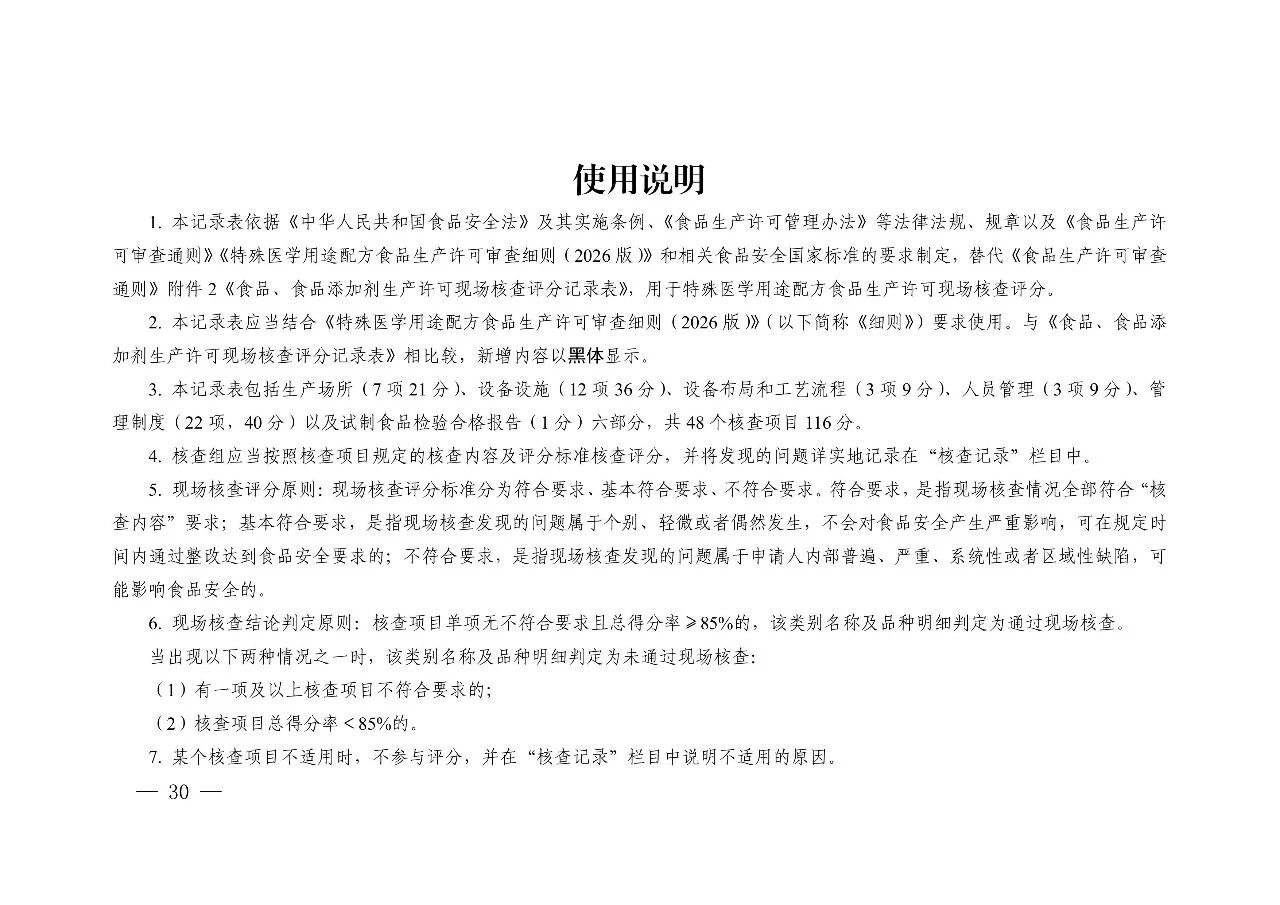 《细则》为严格生产许可,统一现场核查标准,在通用《食品、食品添加剂生产许可现场核查评分记录表》的基础上,制定了《特殊医学用途配方食品生产许可现场核查评分记录表》,作为附件,规范现场核查工作,保障核查工作质量。